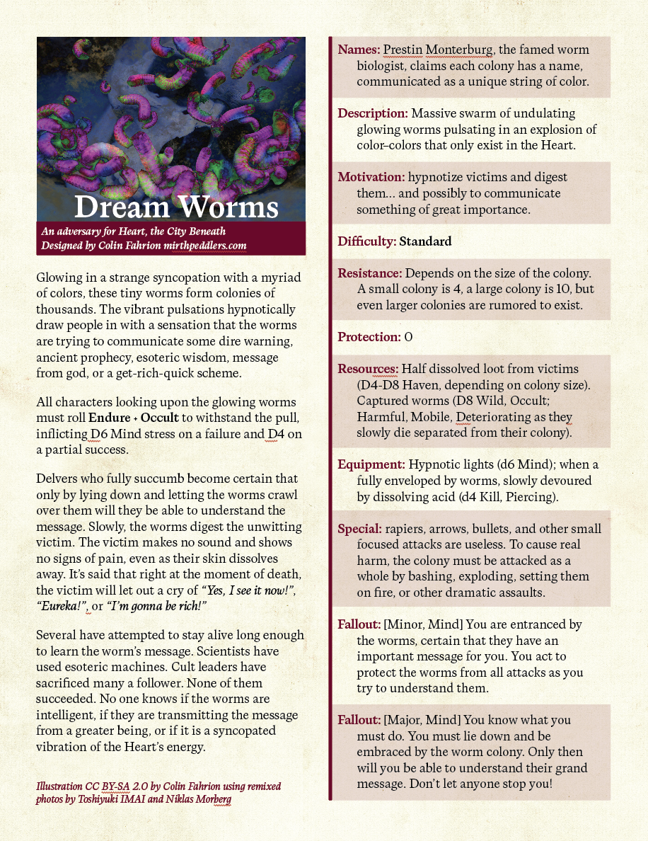 Glowing in a strange syncopation with a myriad of colors, these tiny worms form colonies of thousands. The vibrant pulsations hypnotically draw people in with a sensation that the worms are trying to communicate some dire warning, ancient prophecy, esoteric wisdom, message from god, or a get-rich-quick scheme. Delvers who fully succumb become certain that only by lying down and letting the worms crawl over them will they be able to understand the message. Slowly, the worms digest the unwitting victim.